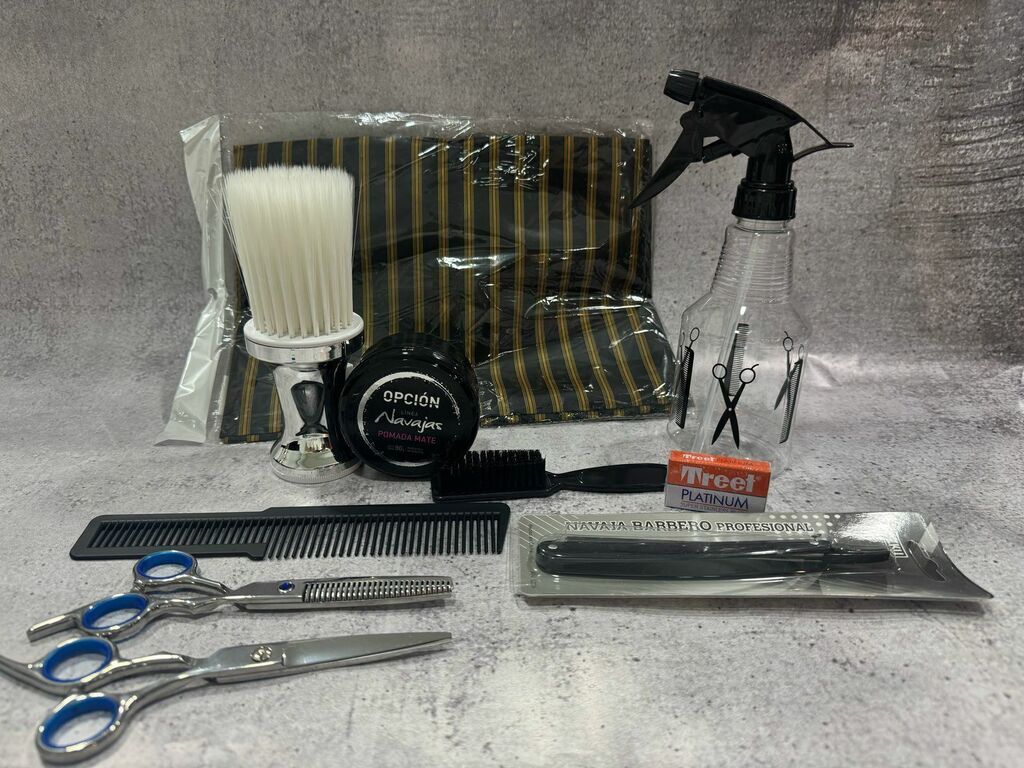 el combo está compuesto por capa de corte,rociador,sacpelos,tijeras filo dulce y de pulir ,peine guía,cepillo,navaja,caja de filos y pomada mate navajas